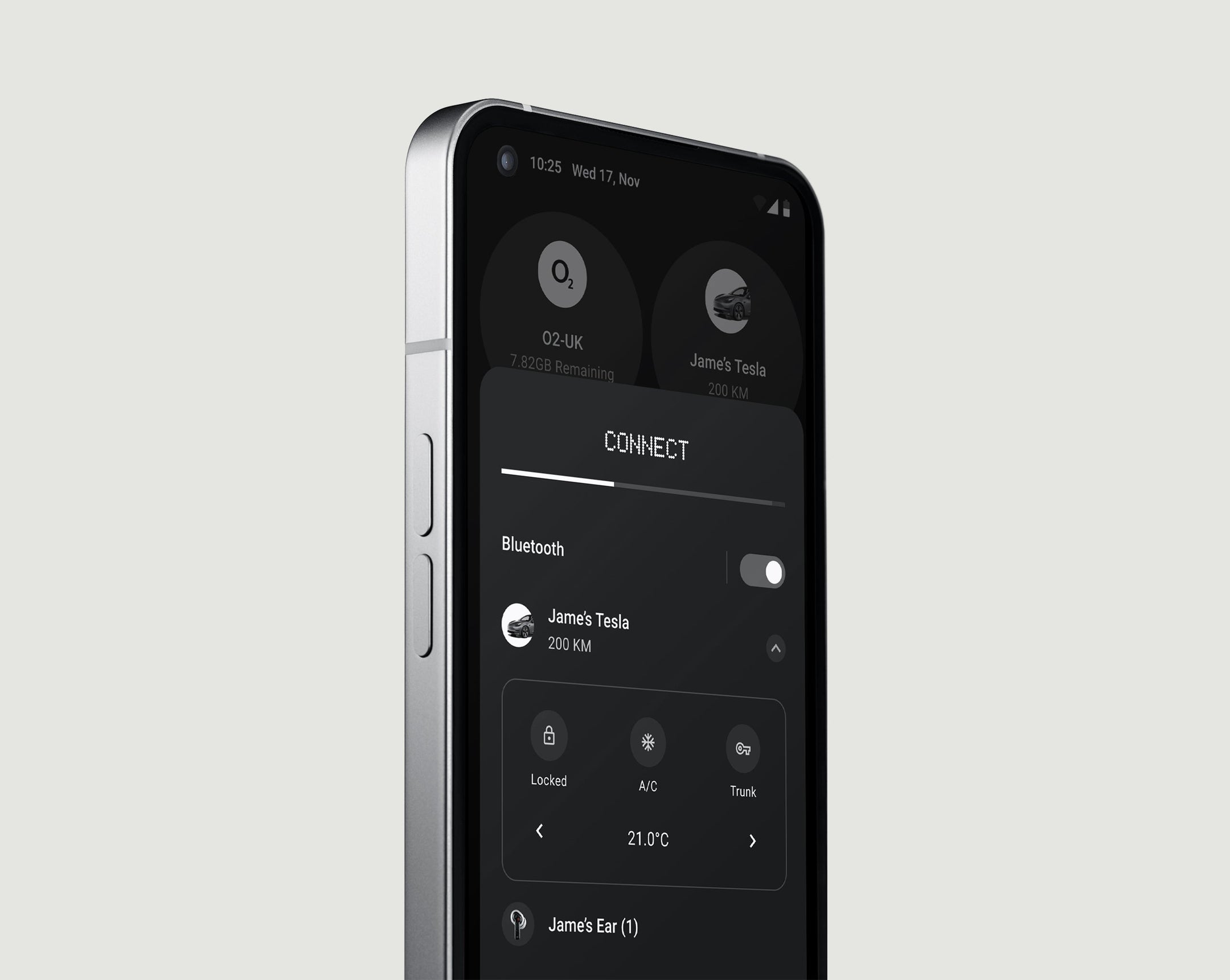 Nothing Ecosystem is an open invitation. Control third party products from Quick Settings as easily as Nothing ones. Starting with Tesla. Unlock doors, turn on AC and see miles left. Check AirPods battery status. No separate apps. One home for everything.